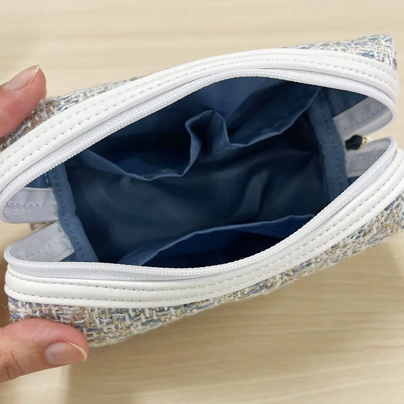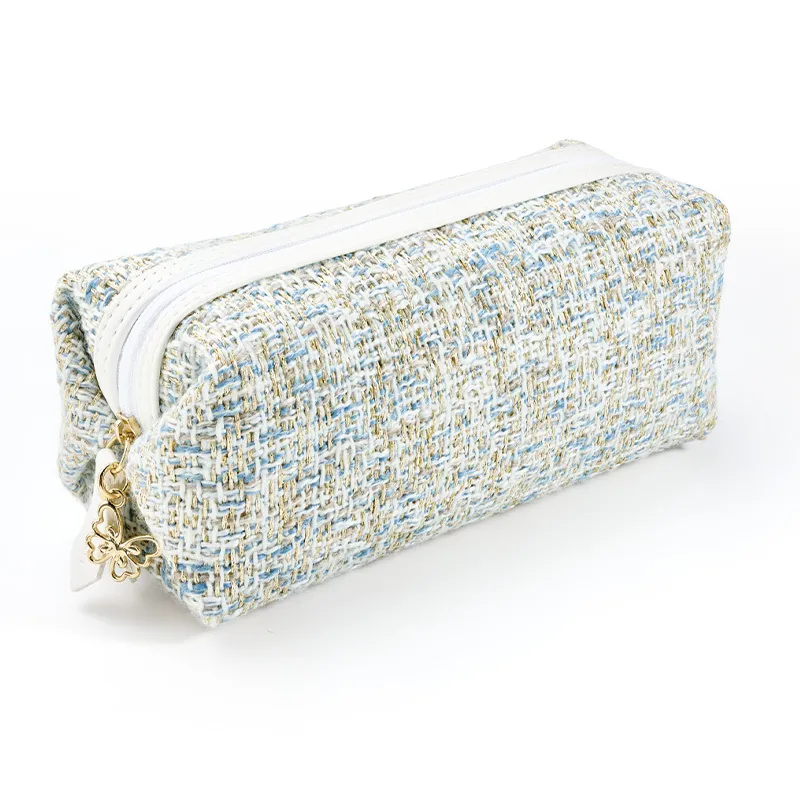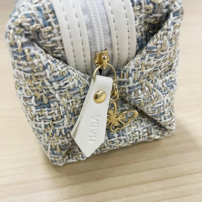 パピヨン(蝶)のチャームがついた ツイード生地のポーチ。ゴールドとブルーの糸を織り込んでおり華やかです! コフレのアイテムがすべておさまる収納力で使いやすいのも魅力。