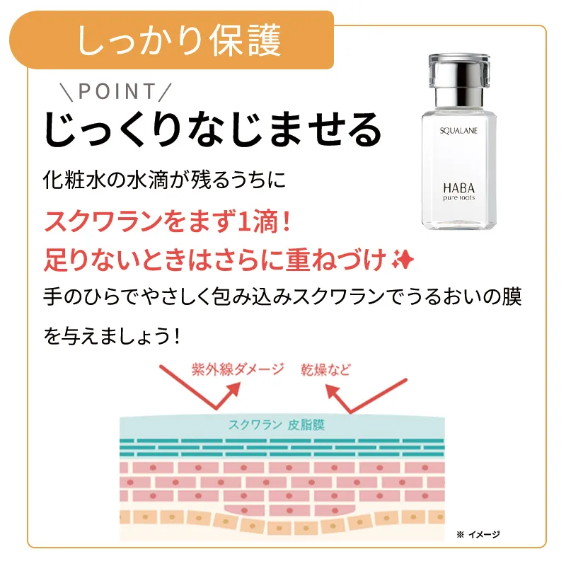 化粧水で「たっぷりうるおす」+スクワランで「しっかり保護」をしましょう!