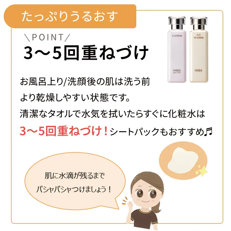 まず、化粧水は3~5回重ねづけです!が、元々肌が乾燥しやすい方は、5回重ねづけがおすすめ。