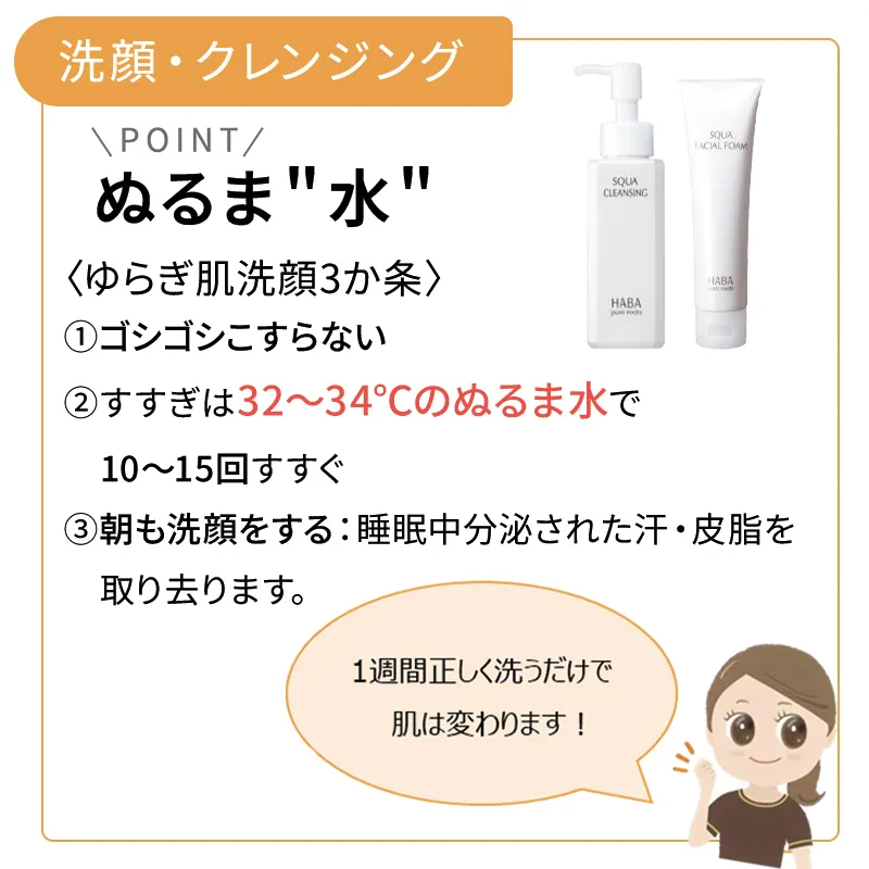 肌の汚れは落としても、肌がもともと持っているうるおいを落とさぬよう、すすぎはぬるま “水”がおすすめ!!朝も洗顔料でやさしく洗いましょう。
