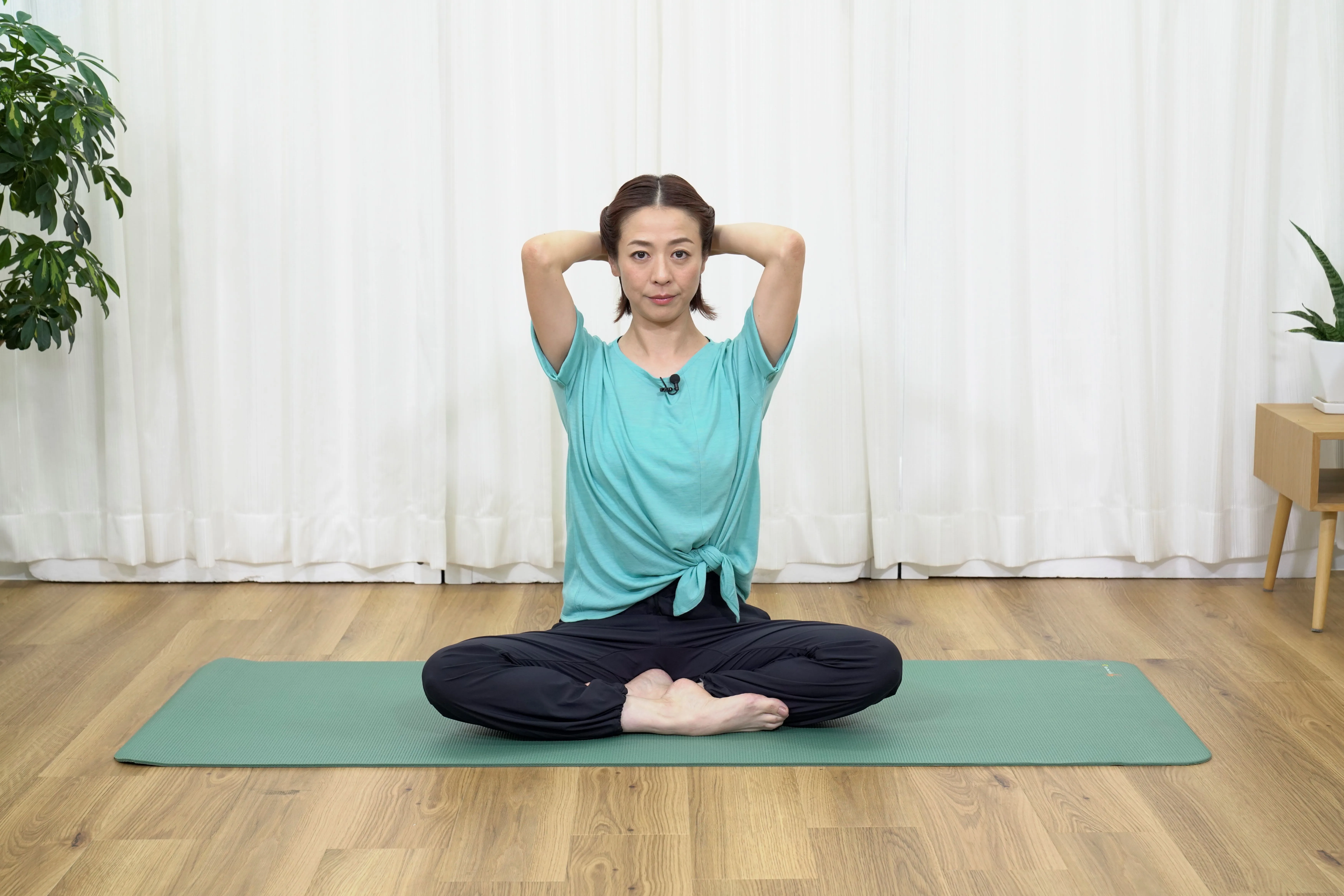 あぐらを組み、姿勢を正したら頭の後ろで両手を組みます。この時、頭が前に落ちないように、あごを引いて頭で手を押すようにしてください。