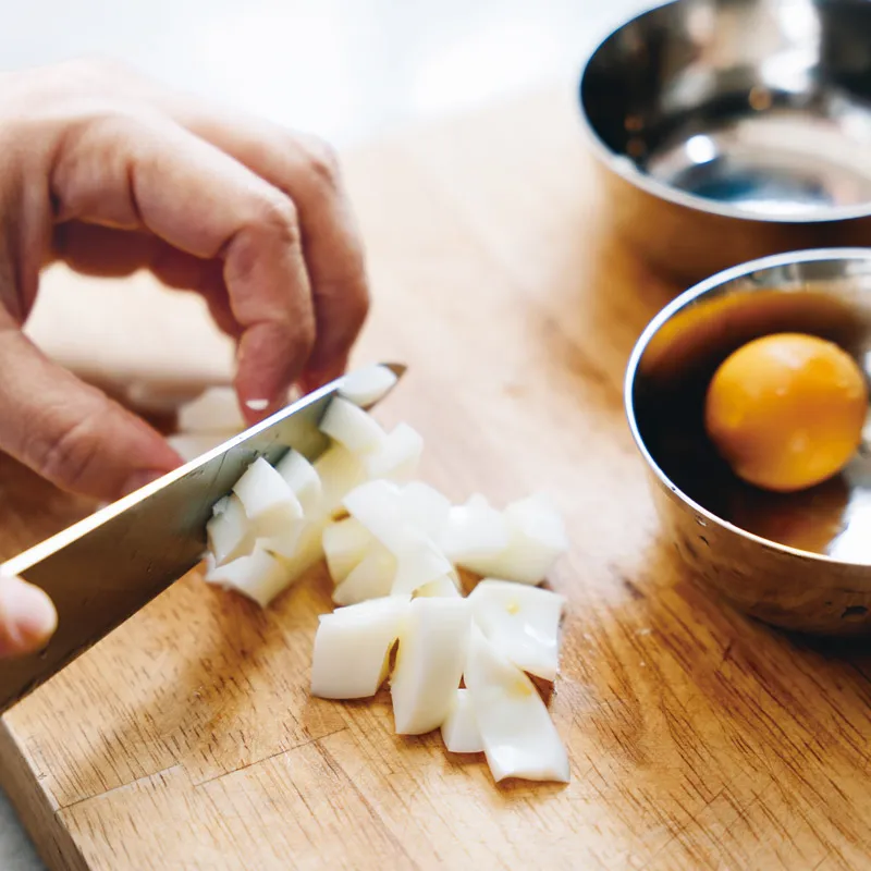 2. マッシュルームは薄くスライスする。かたゆで卵をつくり、黄身と白身に分け、白身は粗みじん切りにしておく。