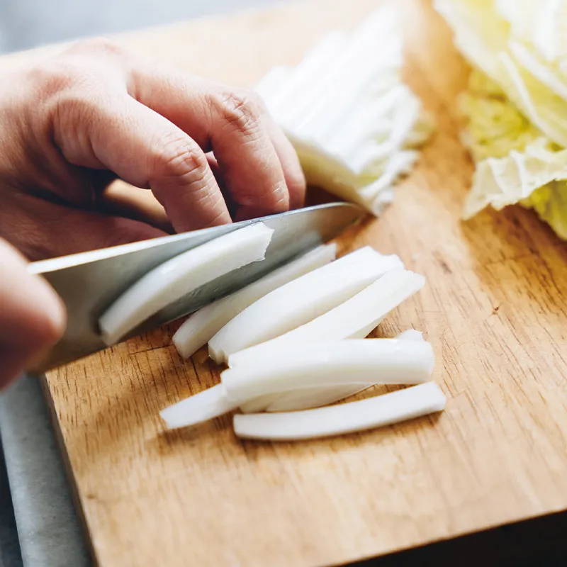 1. 白菜を葉と茎に分け、茎の白い部分は繊維に沿って5mm幅の千切りにし、葉は食べやすい大きさにざく切りにする。