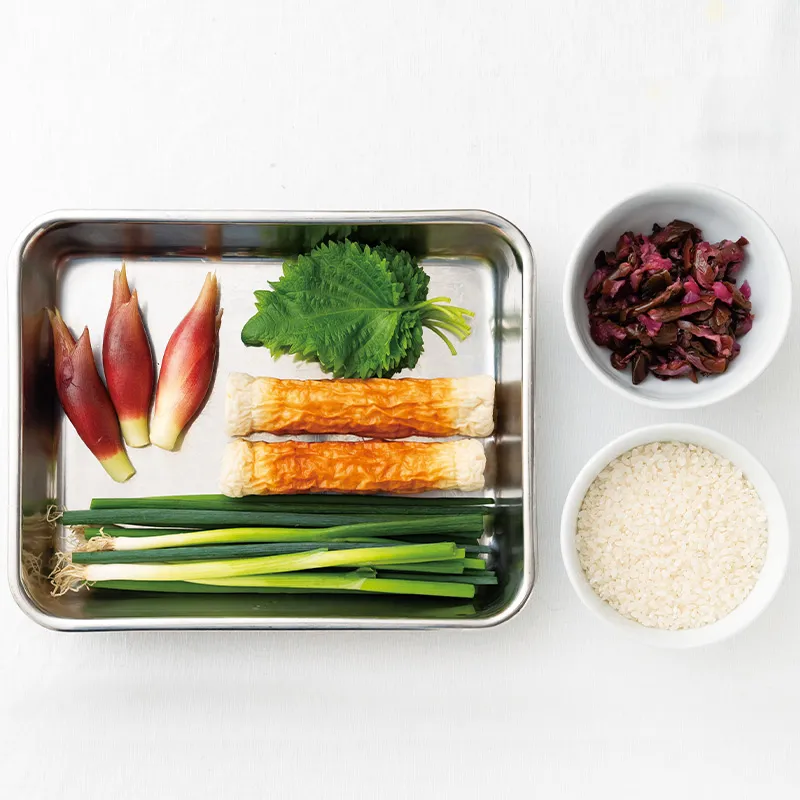 2.ちくわ、みょうがは輪切りに、大葉は千切りに、しば漬けは粗く刻む。