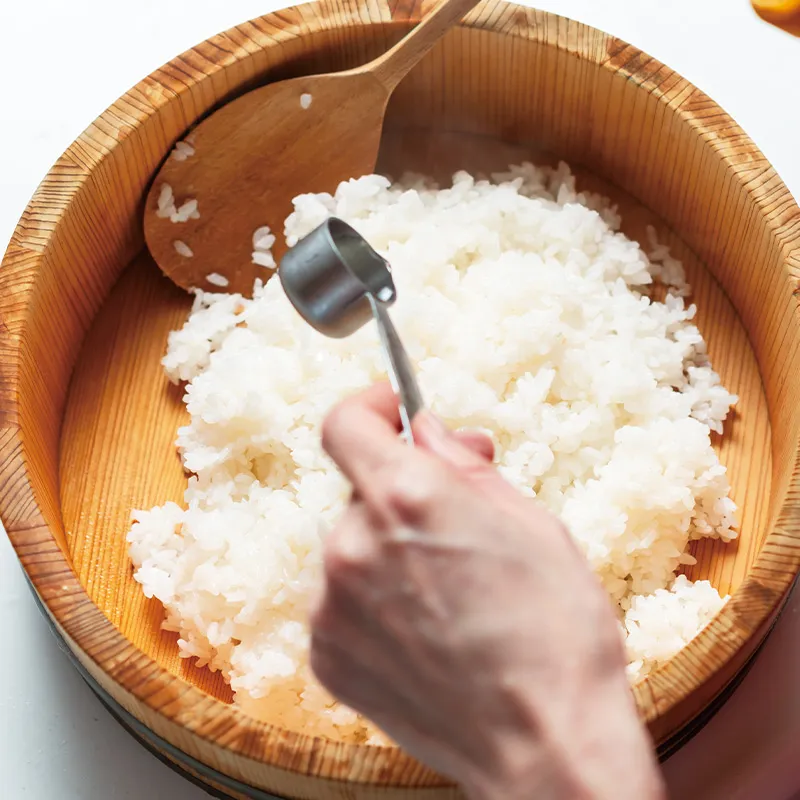 すし酢とマービー粉末を混ぜたものを、全体に行き渡るように回しかけます。