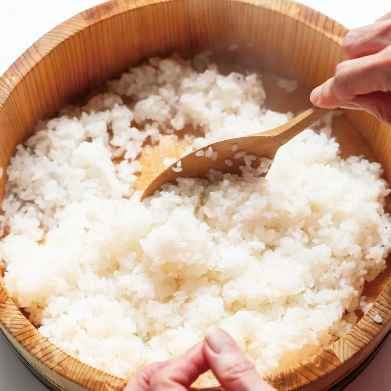 1.炊き立てご飯に、すし酢とマービー粉末を混ぜたものをまわしかけ、切るように混ぜる。