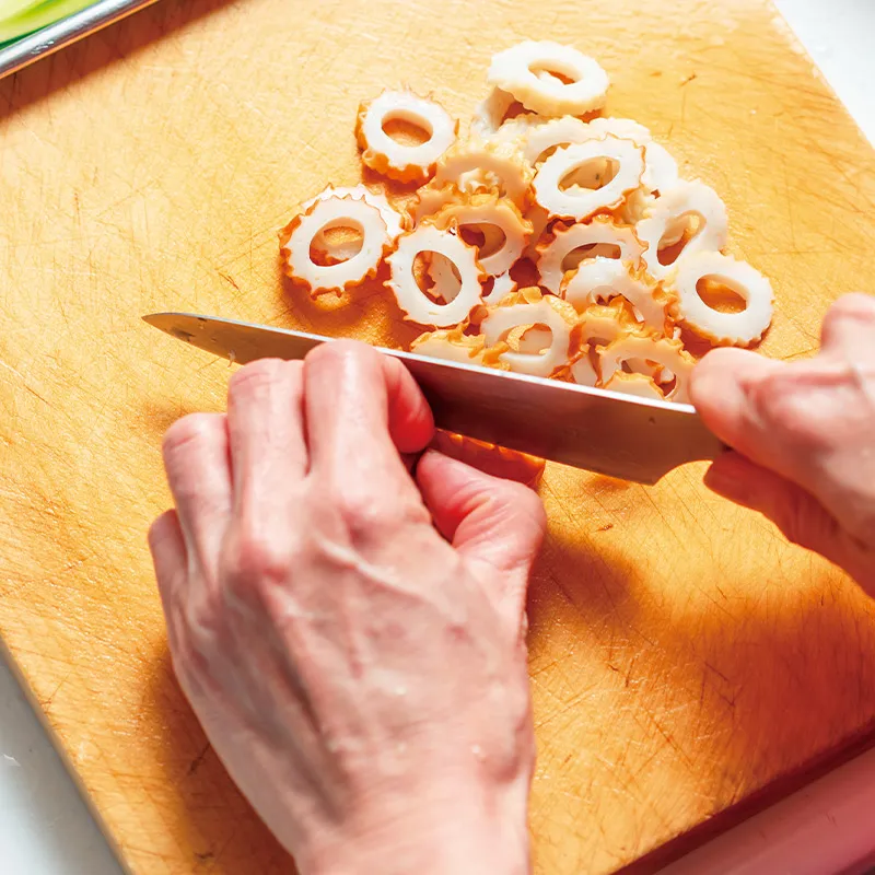 ちくわとみょうがは輪切りがおすすめ。見た目も食感も楽しめます。