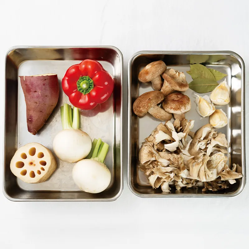 1. さつまいもは乱切りにする。れんこんは5mm幅に切る。かぶは茎を残してくし形に切る。パプリカは半分に切って種を取り乱切りに。まいたけは大きくほぐす。しいたけは半分に切る。