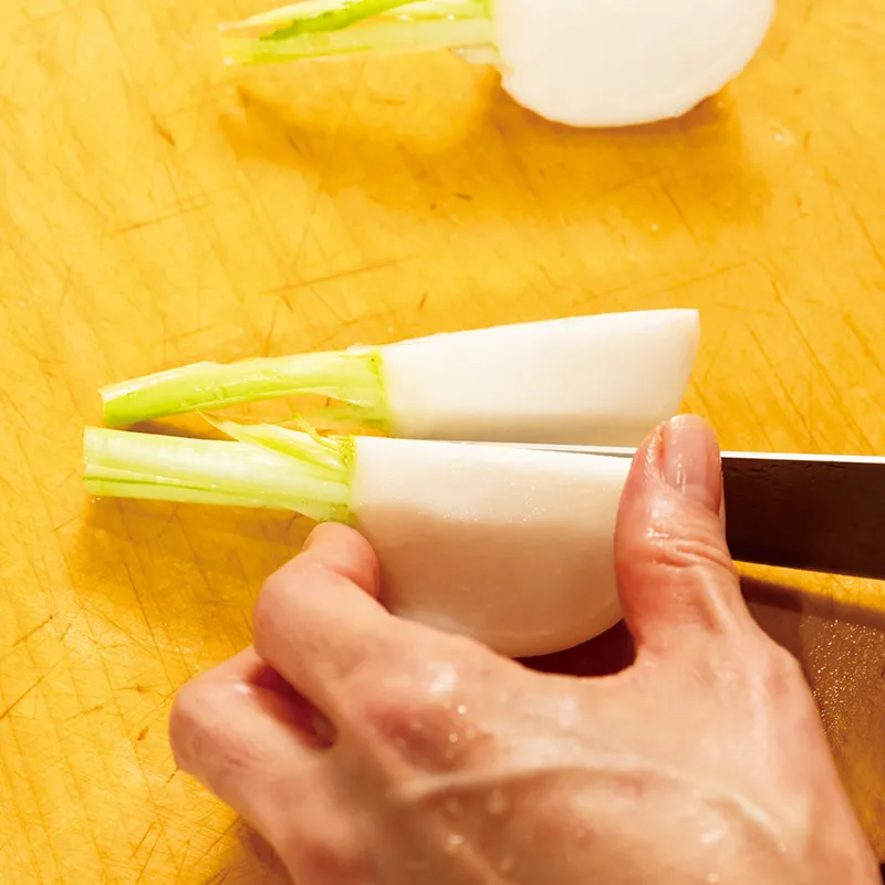かぶは茎を残してくし形に切る。