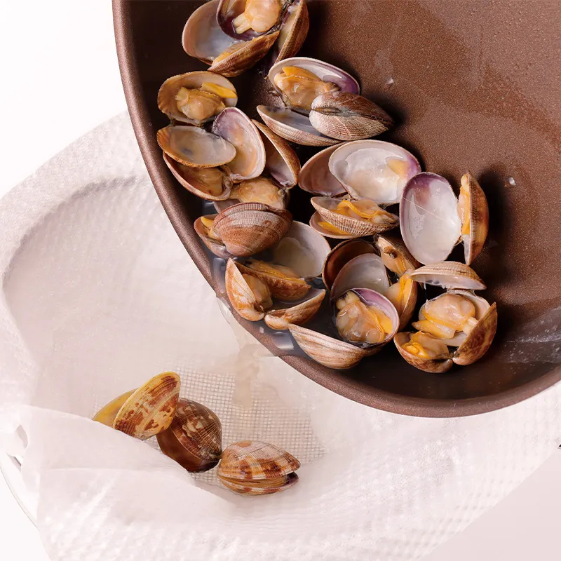 アサリから出た煮汁はペーパータオルでこす。煮汁にマービー液状を加えて混ぜる。