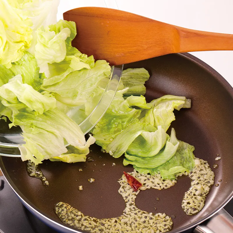 フライパンにオリーブオイルを入れ、赤唐辛子とにんにくを加えて弱火で炒める。香りがたったら、レタスを加えて強火でさっと炒める。