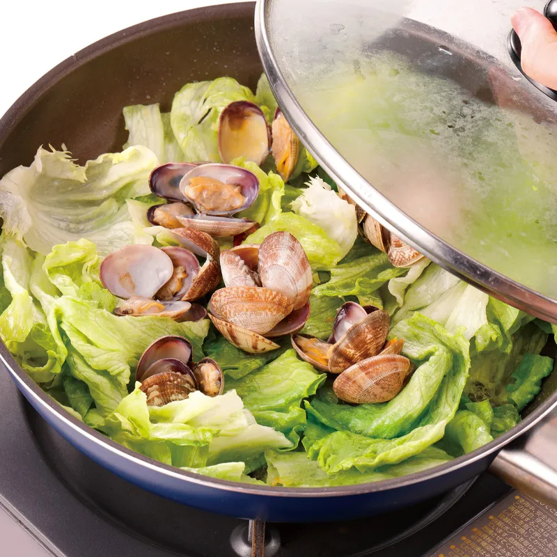 ポイント1のマービー液状を加えた煮汁と、アサリを入れて、フタをしてレタスが色よくなるまで蒸す。