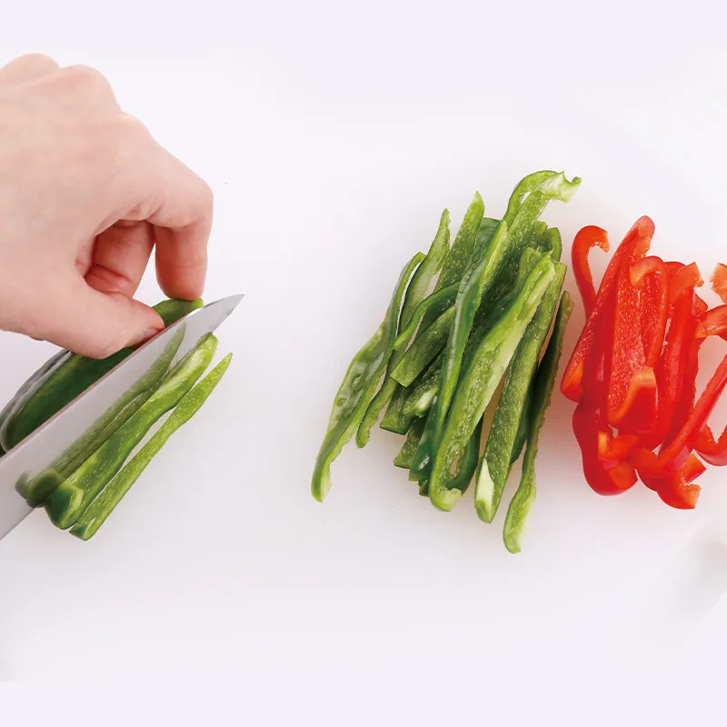 ピーマンは縦半分に切り、種を取って、5mm幅に切る。
