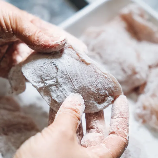片栗粉をまぶすことで鶏肉の水分が外に流れ出にくくなり、しっとりやわらかな仕上がりに。さらに、タレがからみやすくなります。