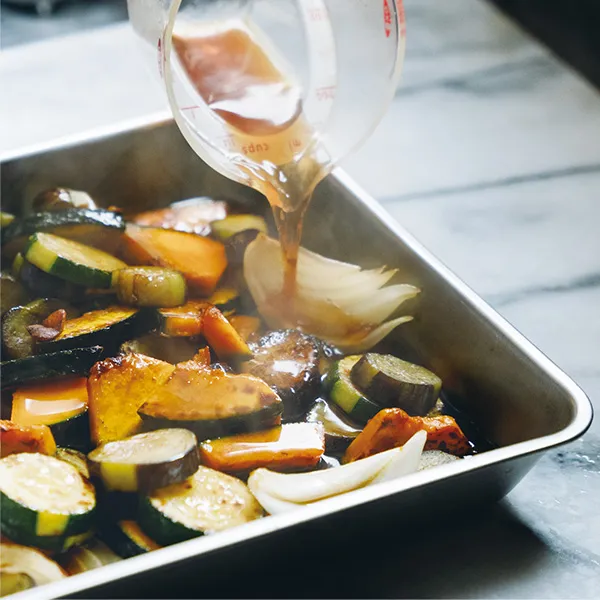 野菜が熱いうちにマリネ液をまわしかけるのがポイント。これだけで、グッと味が染み込みやすくなります。