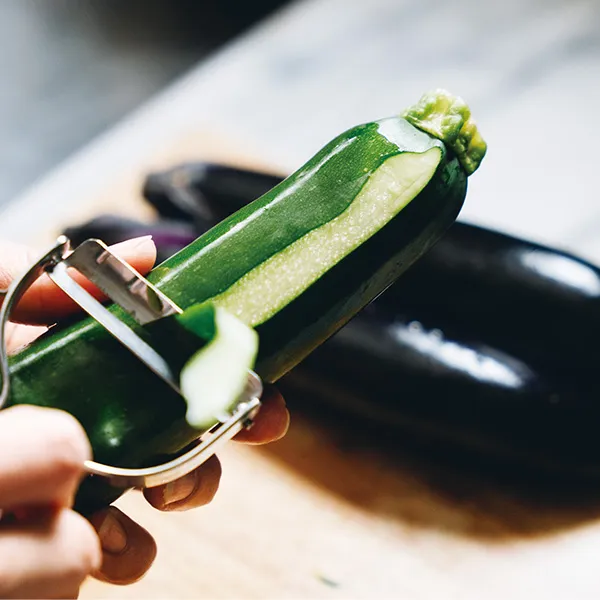 ナスとズッキーニはしま目に皮をむくことで火の通りがよくなり、味が染み込みやすくなります。見た目にも華やかに仕上がります。
