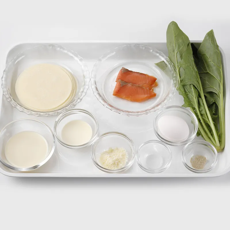 3. ほうれん草は洗ってからラップにくるみ、600Wの電子レンジで30秒加熱し、水にさらし、水気を絞って3cmに切る。スモークサーモンは1枚を4つに切る。