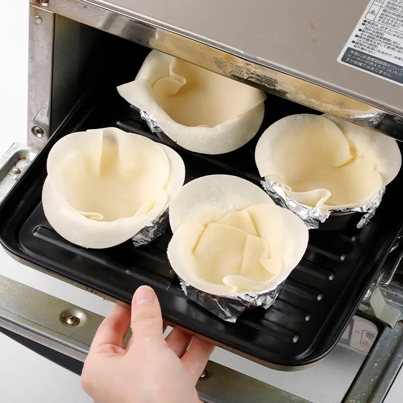 2. オーブントースター180度で8分こんがりと加熱し、カップをつくる。