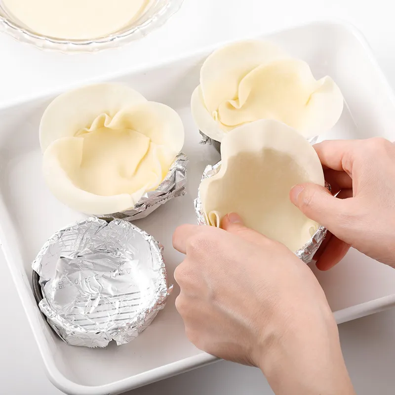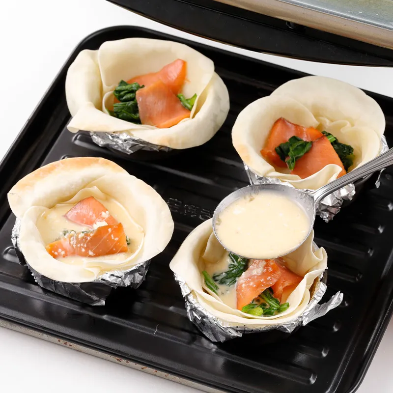 1. 餃子の皮3枚を少しずらしてホイルを敷いたマフィンカップに入れる。これを4個分つくる。