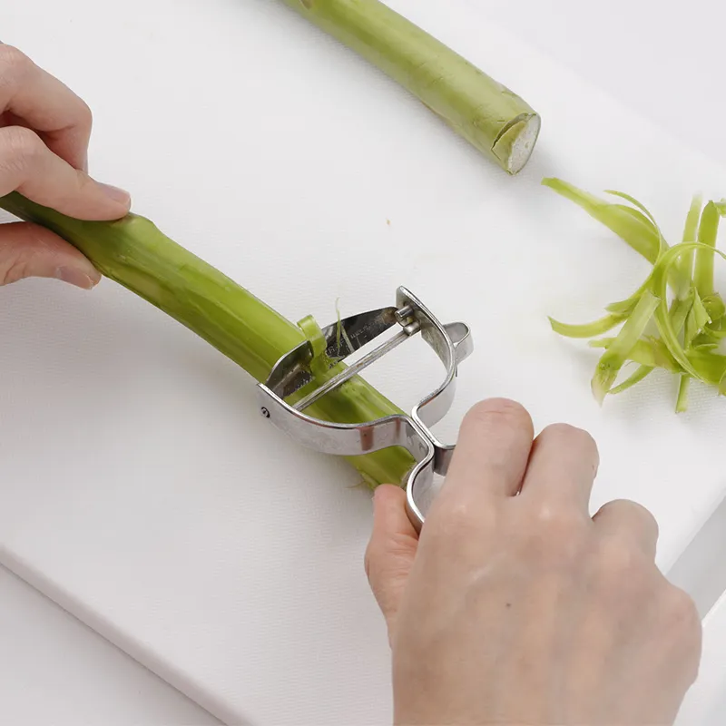 1. アスパラガスはかたい部分をピーラーでむき、4cm幅くらいに切る。