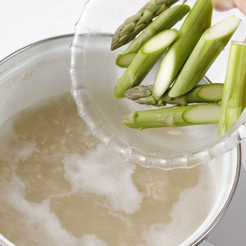 1%の塩を加えた湯でもち麦を15分ほどゆで、ゆで上がり1分前にアスパラガスを入れて一緒にゆでる。