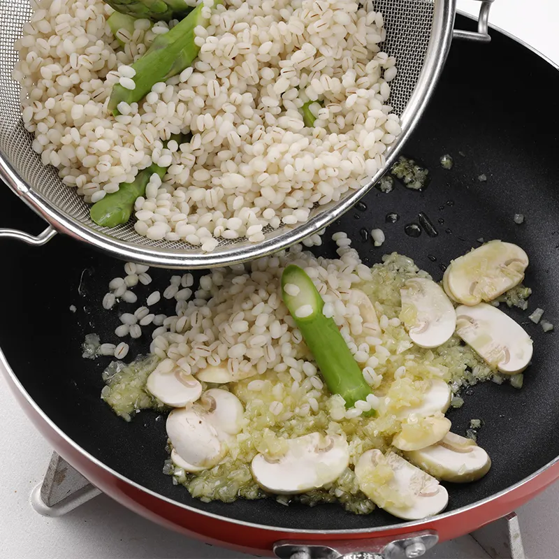 3. もち麦は1%の塩を加えた湯で15分ほどゆでる。ゆで上がり1分前にアスパラガスを入れて一緒にゆでて、ざるにあげて水気を切る。