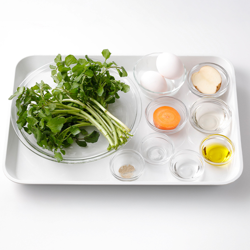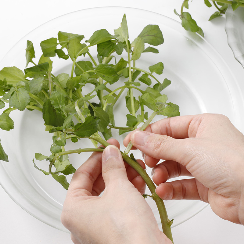 2. クレソンはやわらかい葉の部分をつむ。茎は薄く切る。