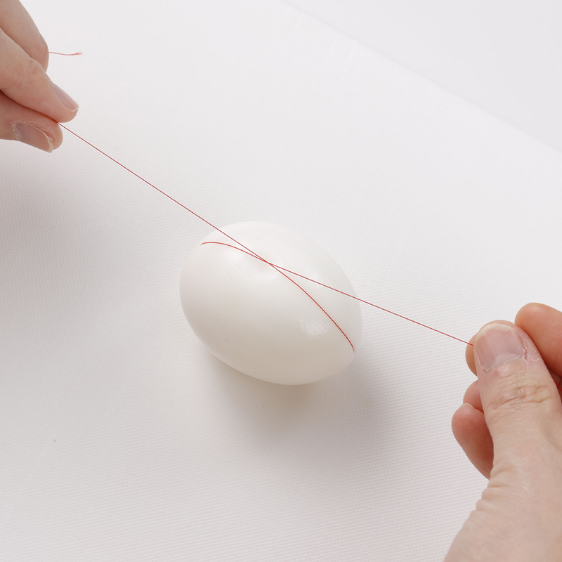 3. ゆでたまごは殻をむき、糸を使ってそれぞれ8つに切る。