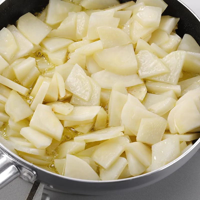フライパンにオリーブオイルとじゃがいもを入れて火にかけ、弱火で素揚げする。