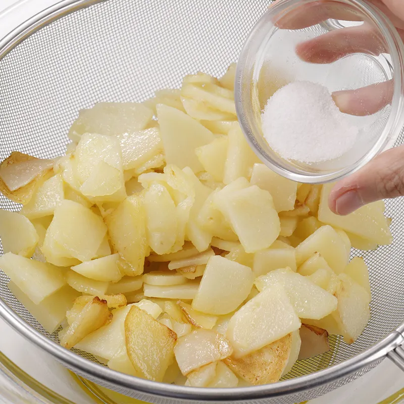 やわらかくなったらじゃがいもを取り出し、塩をふる。