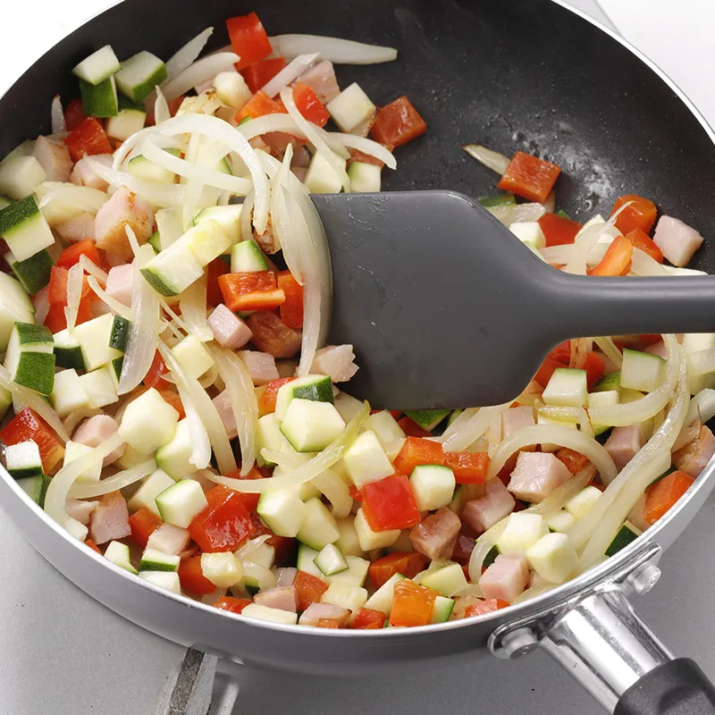 3. 同じフライパンで1.の玉ねぎ、赤パプリカ、ズッキーニ、ベーコンを炒める。