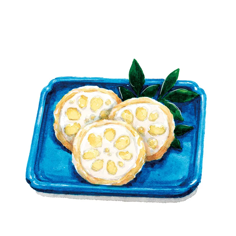 蓮根にからしみそを詰め、黄色い衣をつけて揚げたもの。絶妙な辛さとシャキッとした歯ざわりが最高。 イラスト©イナコ