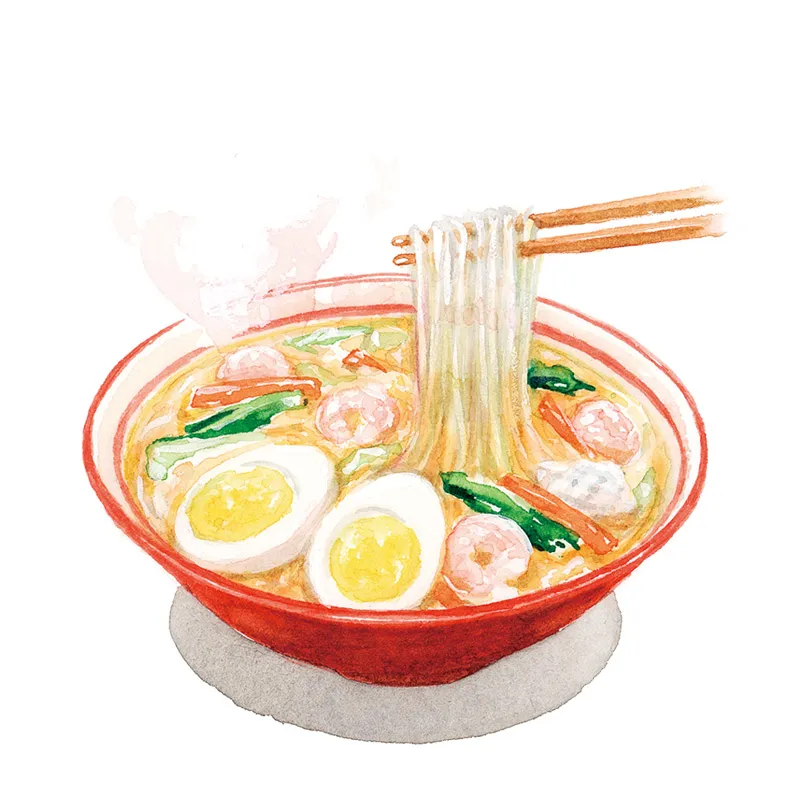 あっさりとした鶏ガラスープに野菜、魚介、春雨が入った郷土料理。学校給食にも出されているそう。 イラスト©イナコ