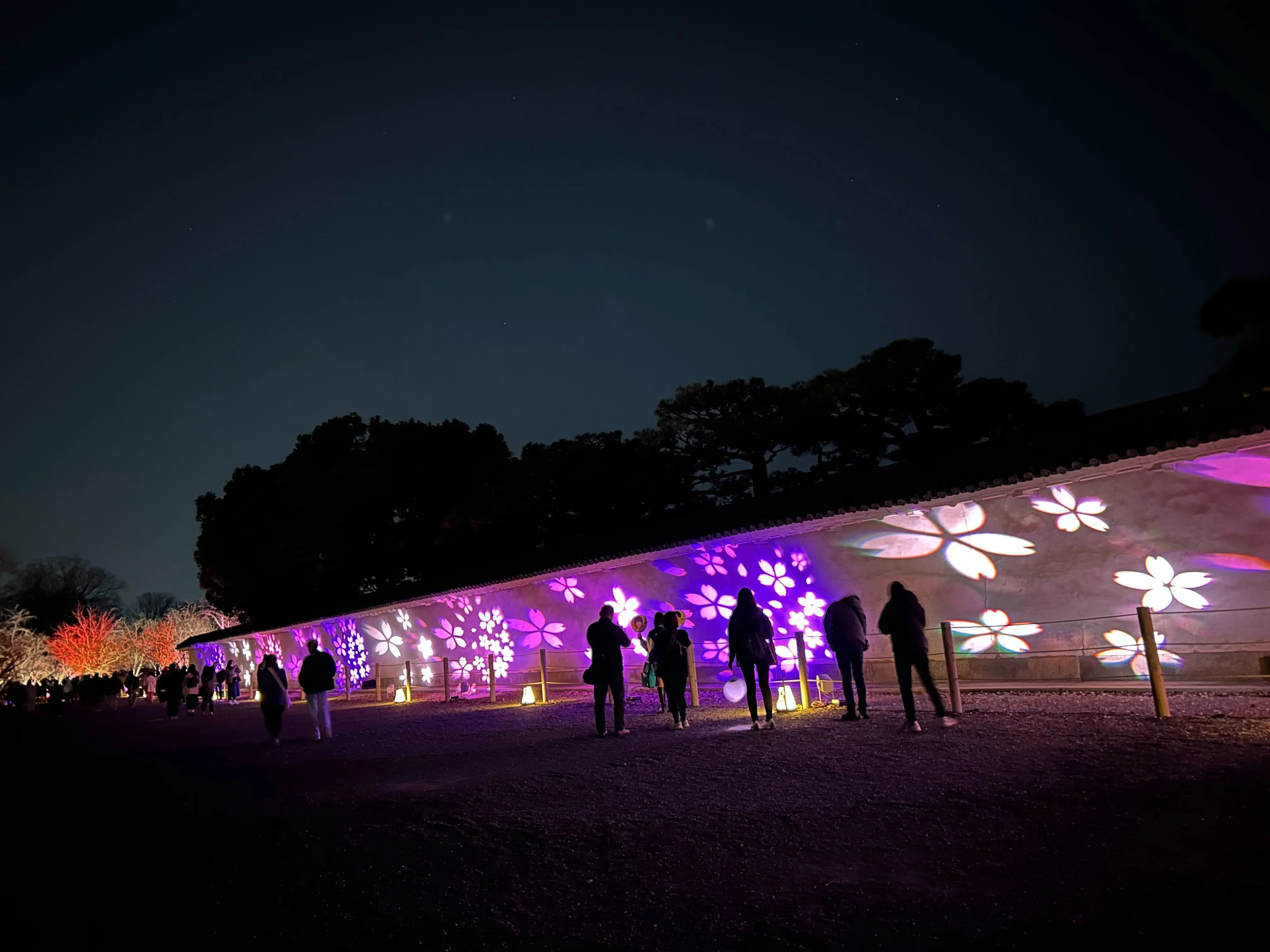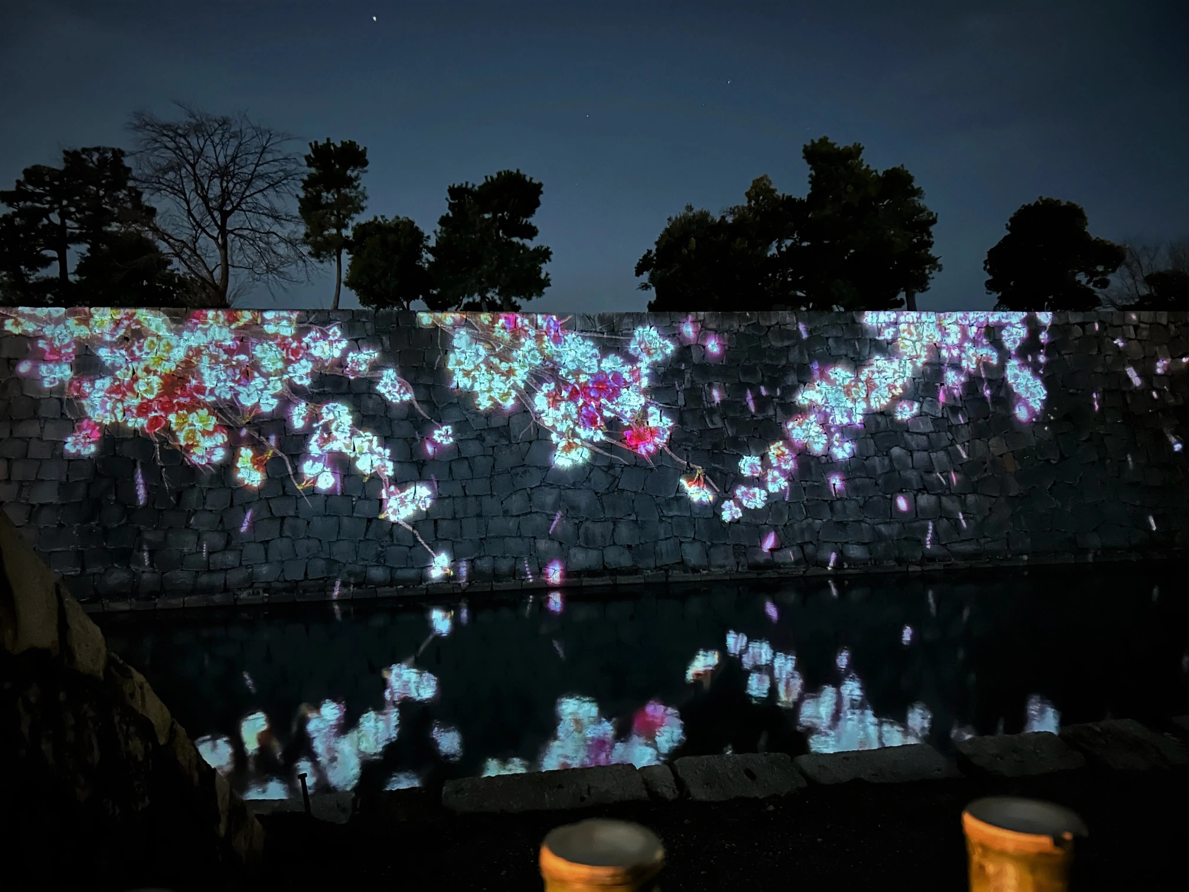 そして、日が暮れて暗くなるとライトアップやプロジェクションマッピングの演出がはっきりと見えるようになり、一気に春らしさを感じることができました!現代版のお花見という感じです✿