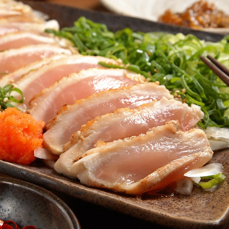 新鮮な鶏肉の刺身はスーパーで購入できるほどメジャー。皮を炙り甘いしょうゆにつけて食べるのが鹿児島流。