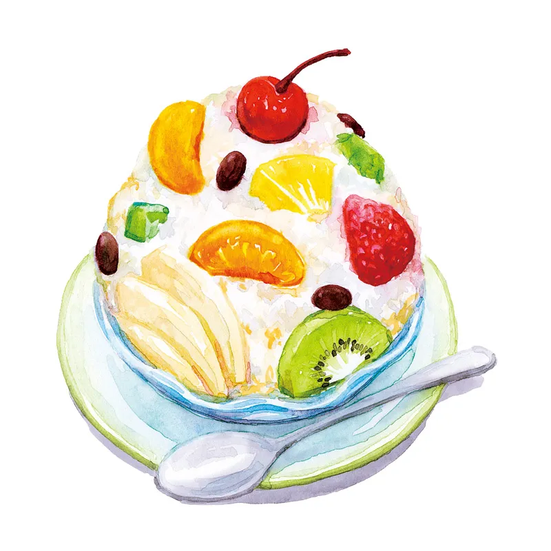 練乳、フルーツ、小豆などをトッピングしたかき氷。コンビニで販売されたことで有名になりましたが、ぜひ本場の味を楽しんで。 イラスト©イナコ