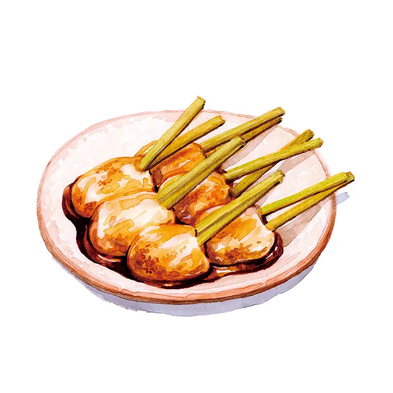餅に2本の串を刺して焼き、とろみのある砂糖しょうゆだれをかけて食べるご当地グルメ。ぢゃんぼ餅=両棒餅と書くそう。 イラスト©イナコ