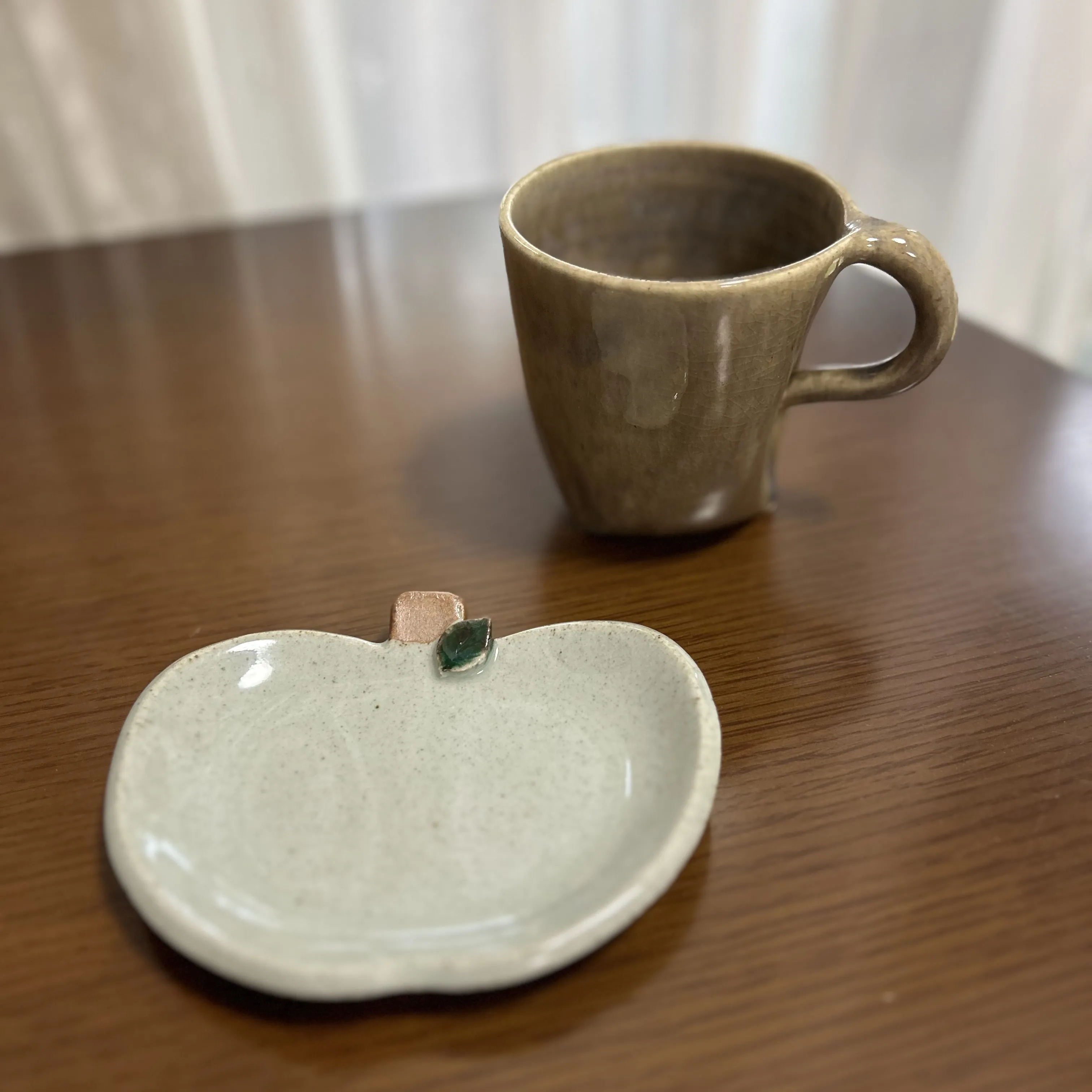 友人の工芸品のお店でみつけた恩納村の工房cerca(セルカ)さんの歩くコーヒーカップを購入しました。りんごのお皿は山形の平清水焼。「やちむん」については以前の記事もぜひご覧ください♪