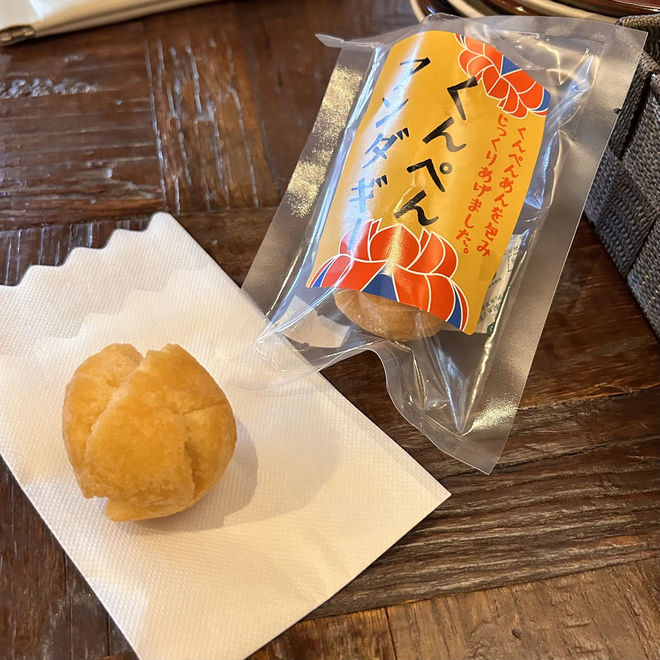 友だちが教えてくれた一品。沖縄の伝統菓子「くんぺん」の餡が入ったサーターアンダギー。これはなかなか美味。知る人ぞ知る新しい味!
