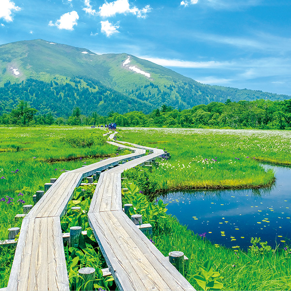 尾瀬国立公園内に広がる湿原で、東西に6km、南北に2kmと本州最大級の広さを誇ります。抜群の開放感の中、シーズンを通してさまざまな高山植物が楽しめるハイキングスポットとして人気です。