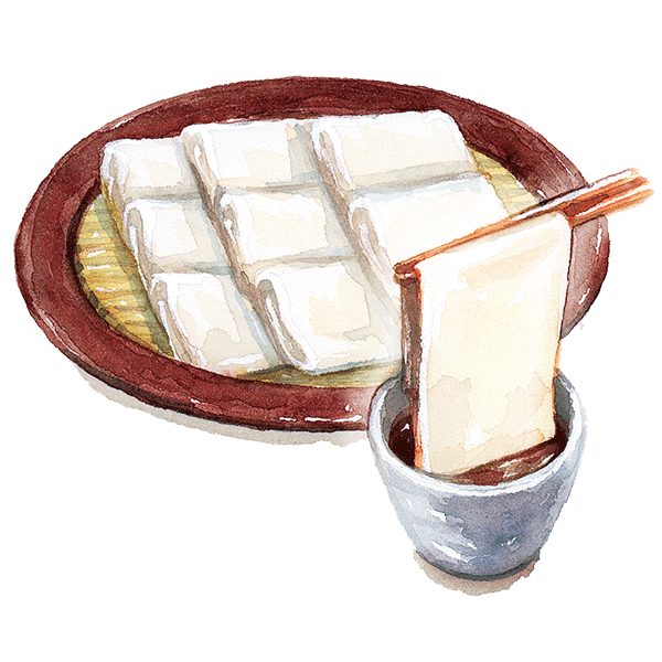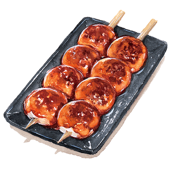 小麦粉と米こうじからつくられたまんじゅうに、みそだれを塗って焼き上げたもの。甘辛いたれが絶品。 イラスト©イナコ