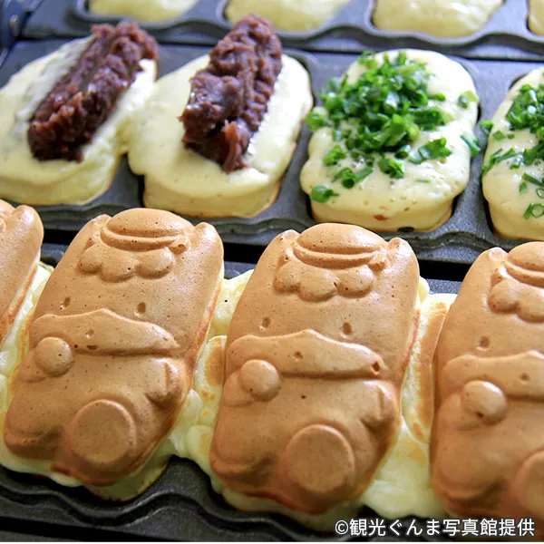 群馬県のマスコット「ぐんまちゃん」の形をした今川焼。お味は粒あん、カスタードなどの定番から、季節の素材を使用した限定メニューまで楽しめます!毎週水曜営業。