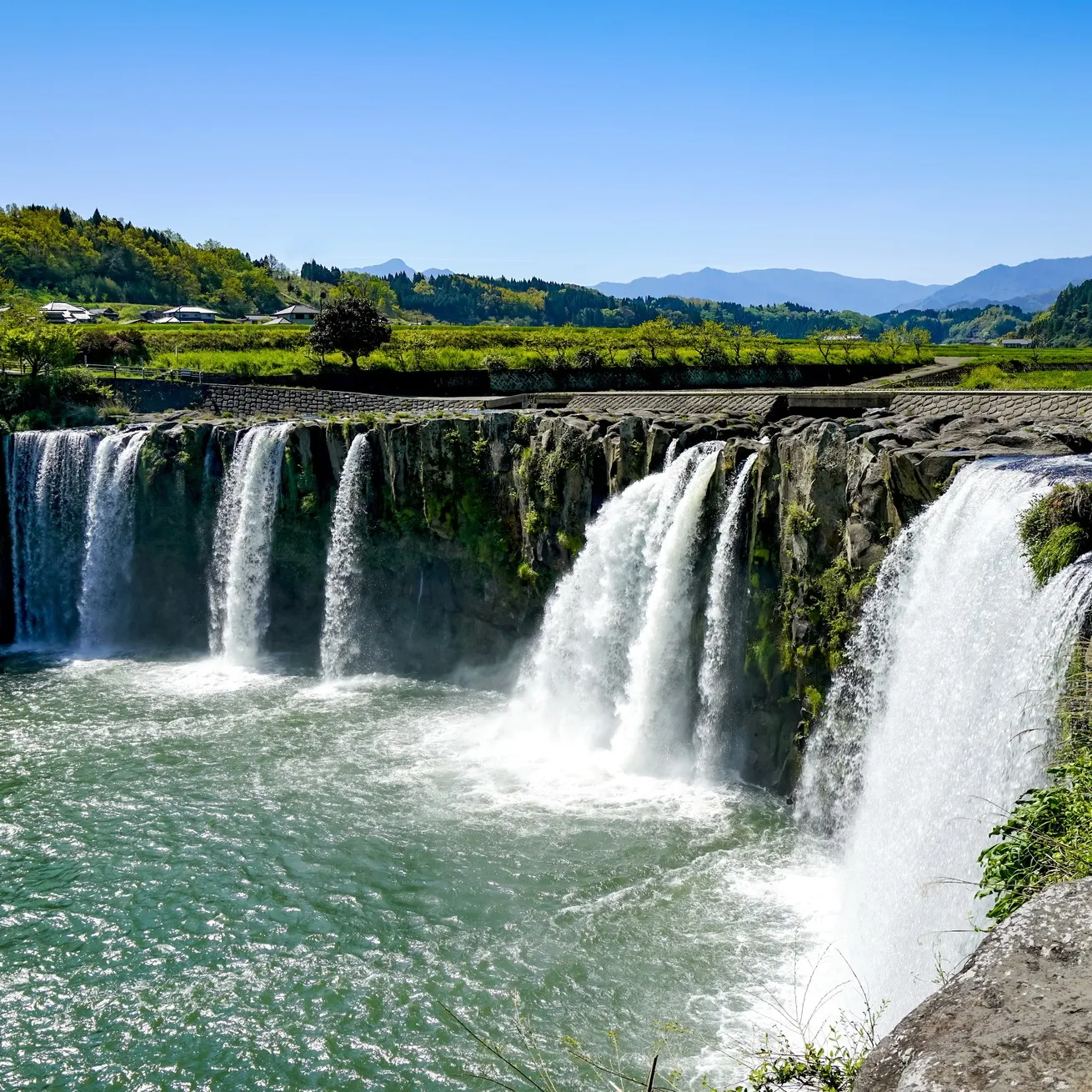 幅120メートル、高さ20メートルを誇り「東洋のナイアガラ」とも称えられる滝。9万年前に起きた阿蘇山の大噴火によってできたといわれており、のどかな田園地帯にふいに現れるという、立地の珍しさも特徴。