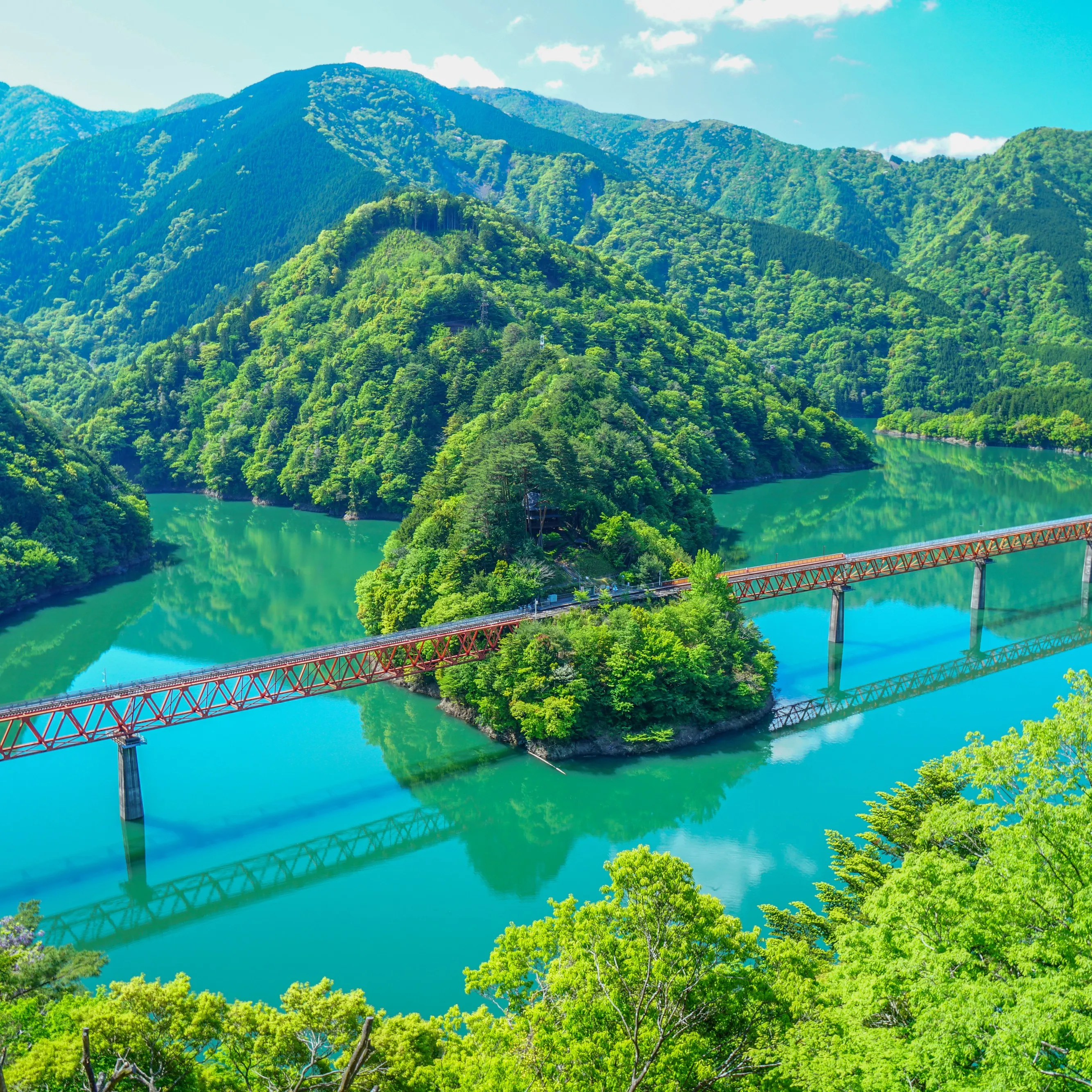湖に突き出した半島にあり「湖上に浮かぶ駅」として人気の大井川鐵道井川線、奥大井湖上駅。エメラルドグリーンに輝く接岨湖(せっそこ)と駅へのびる赤い鉄橋との対比が美しく、多くの観光客が足を運ぶ秘境駅です。線路脇に遊歩道があり、湖上を散歩しながらゆっくりと絶景を楽しむことができます。