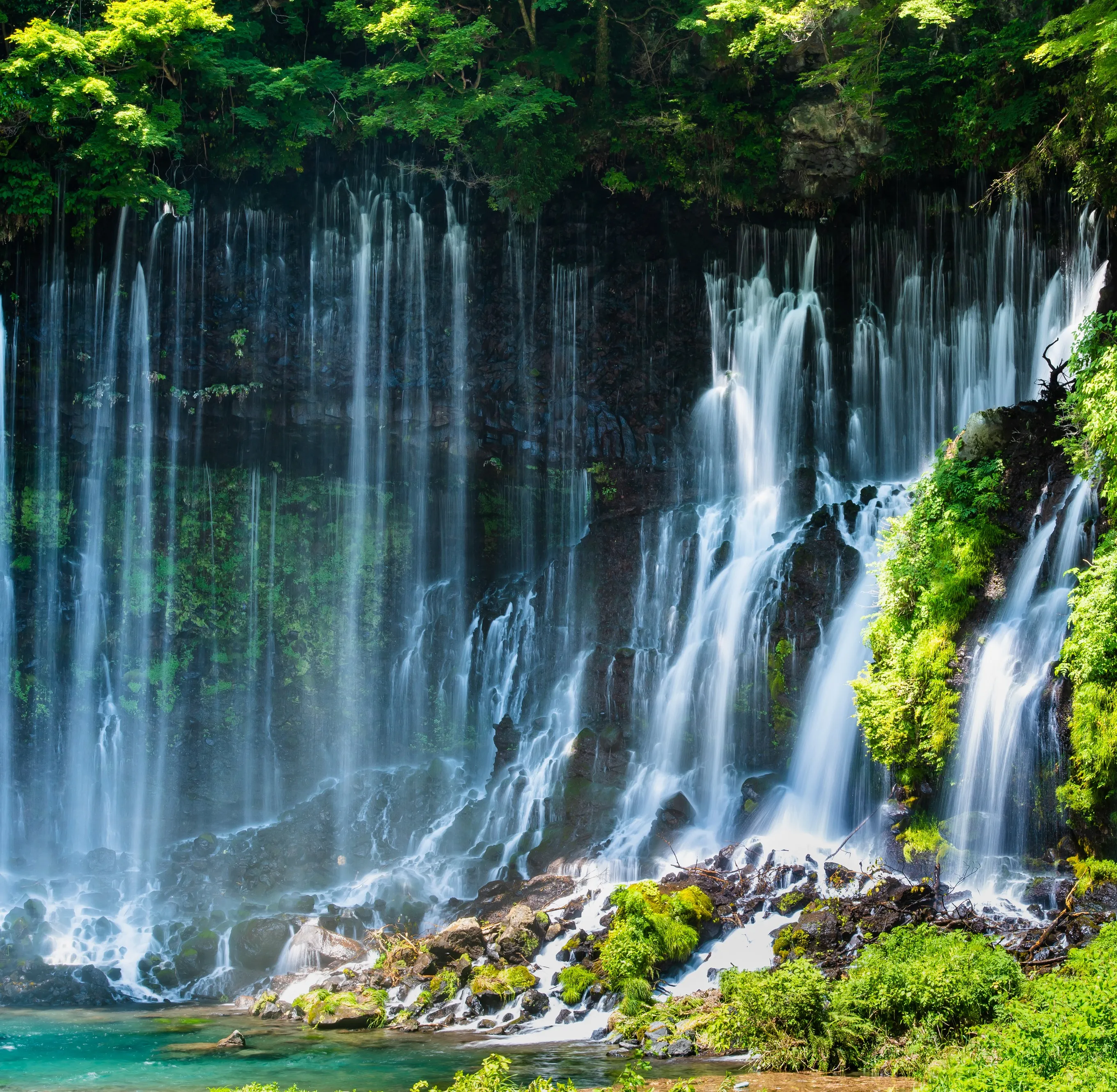 岩壁の間から湧き水が流れ落ちる、全国的にも珍しい滝。幅150m、高さ20mの湾曲した絶壁から水が流れるさまが、白く光る絹糸のように見えることから、この名がついたといわれています。本滝の一部を除いてほとんどが富士山の湧き水であり、そのダイナミックな景観から国の名勝及び天然記念物に指定されています。