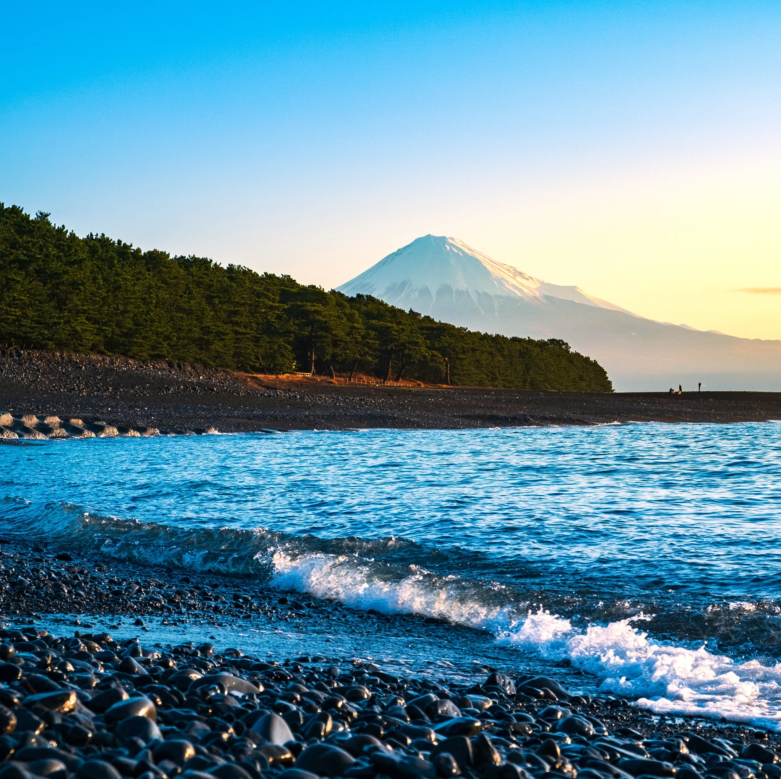 三保半島の沿岸に5kmにわたって続く松林のことで、2013年に世界文化遺産富士山の構成資産として登録されました。駿河湾越しに望む富士山と松林が織りなす美しさは圧巻で、古くから芸術作品の題材として描かれてきました。松林の中央付近にある「羽衣の松」は、天女が舞い降りた羽衣伝説の舞台としても有名です。