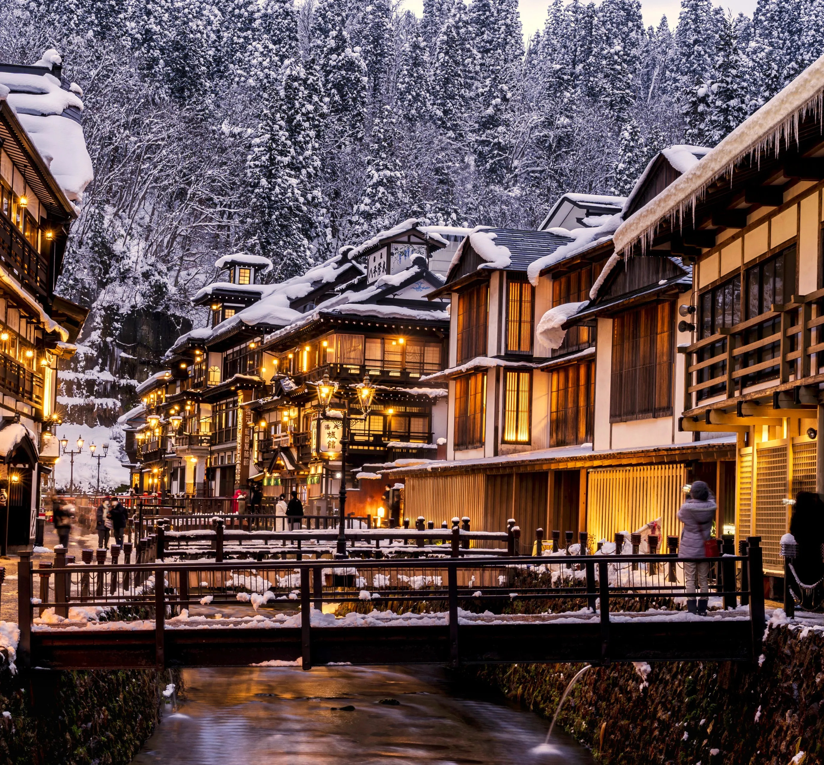 大正、昭和初期の木造旅館が川沿いに並び、ノスタルジックな魅力にあふれる温泉地。江戸時代に栄えた延沢銀山の湯治場として発展したことから、この名がついたといわれています。四季ごとに異なる表情を見せ、特に温泉街が美しく雪に覆われる冬は高い人気を誇ります。