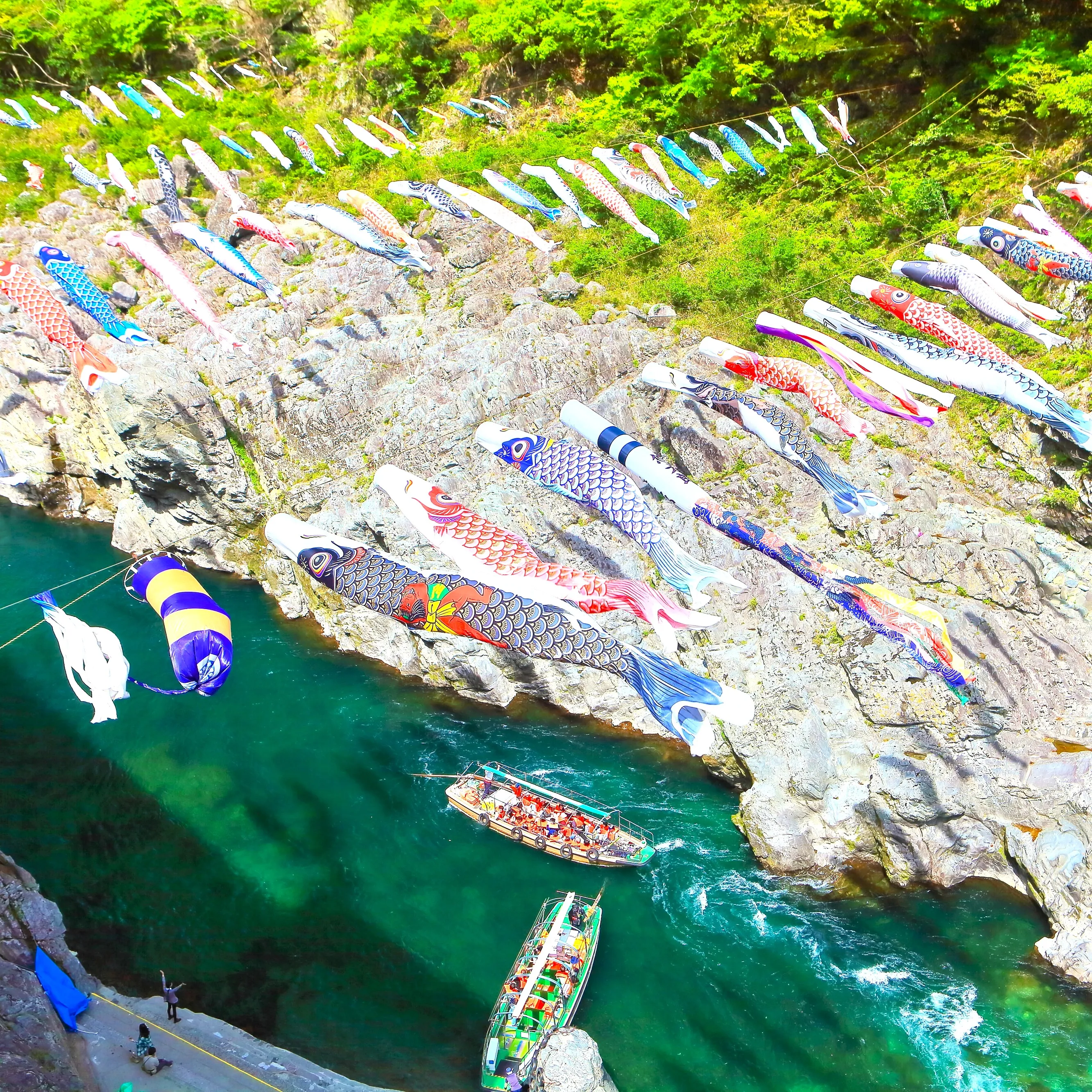 四国山地を横切る吉野川の激流によってつくられた約8kmに渡る渓谷。そそり立つ彫刻のような美しい景観を誇り、国の天然記念物および名勝に指定されています。3月下旬~5月末の大歩危には各地から寄贈された鯉のぼりが飾られ、渓谷内を悠々と泳ぐ姿を見ることができます。