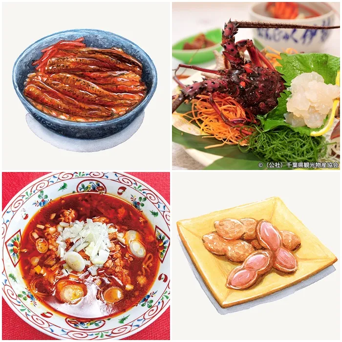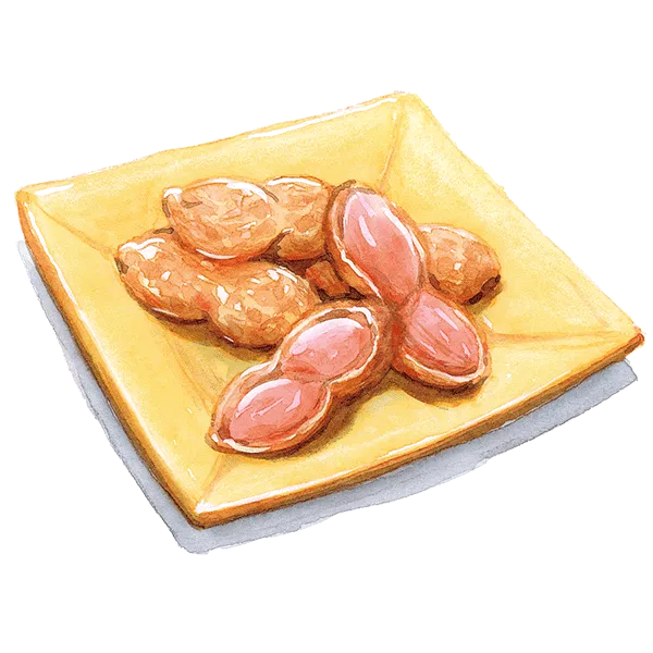 とれたての落花生を殻ごと塩ゆでする県民おなじみのフード。噛むと豆の甘みと程よい塩気が口に広がります。一度味わうとクセになる美味しさのようです。 イラスト©イナコ