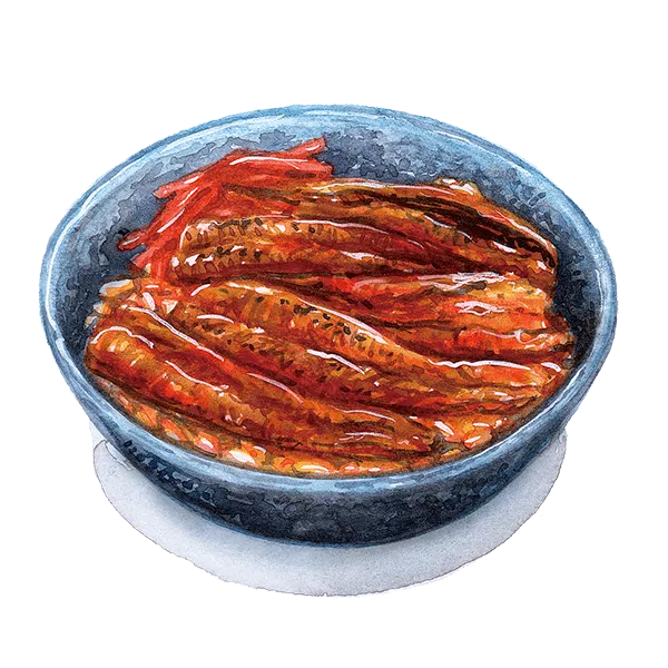 甘辛のだしでふっくらと煮込んだあなごをご飯にどーんとのせた、ご飯がすすむ一品。漁港の棒はかりの細長くて目盛りがふられた形に似ていることからついた呼び名だそう! イラスト©イナコ
